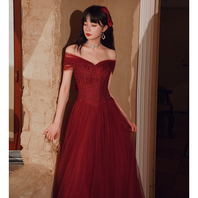 2021 new toast dress bride wedding engagement burgundy summer dress skirt women's light veil one-word shoulder yarn dress summer