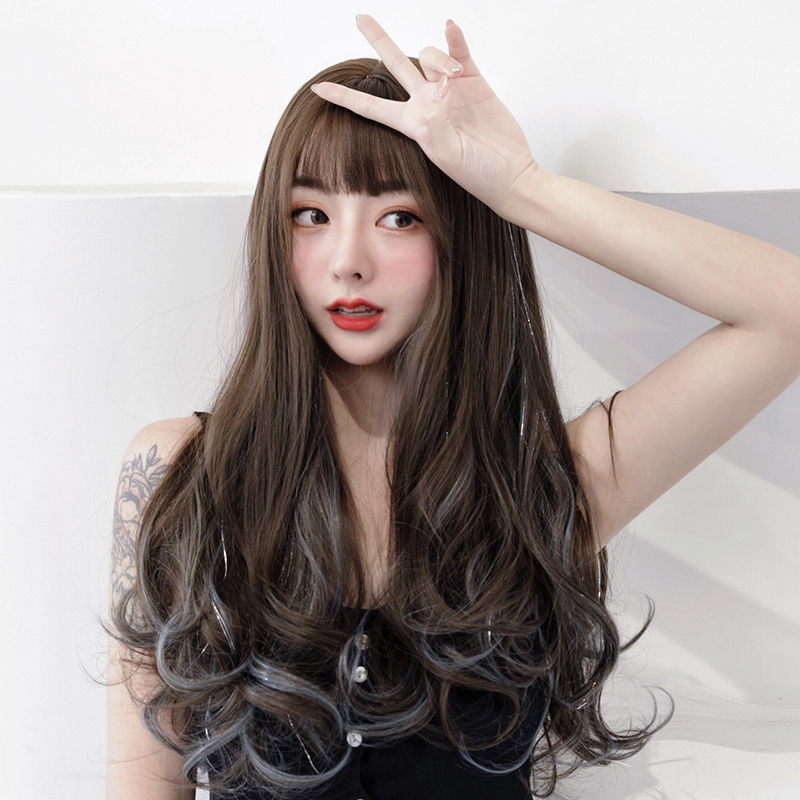 Wig cover woman long hair stylish trend color with bright silk natural realistic full headgear to fix in the face with large wave length roll