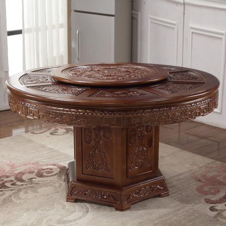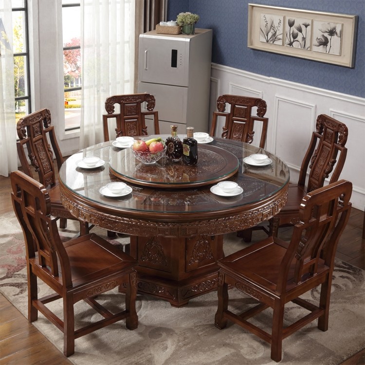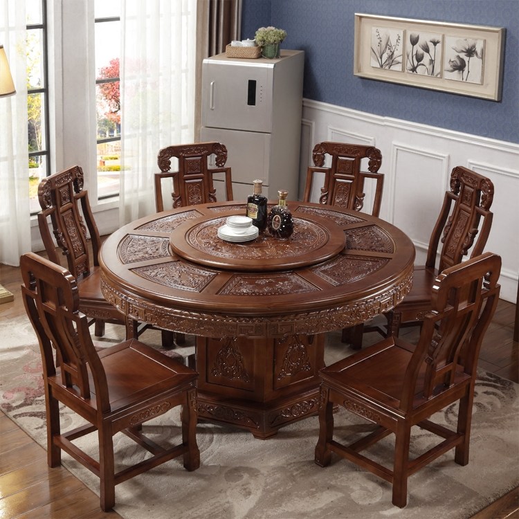 Solid wood new Chinese style round dining table and chair combination carved antique home 2 meters large round table with turntable dining table