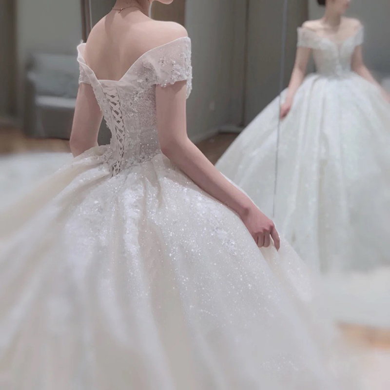 Wedding dress 2021 new style simple bride one shoulder heavy luxury temperament high-end starry net red big tail