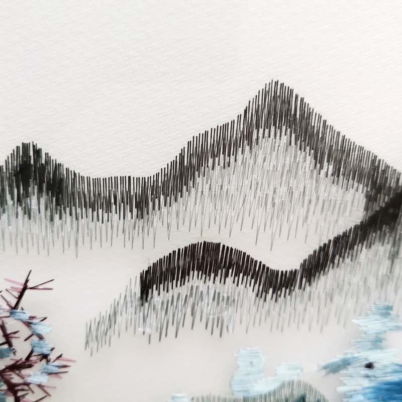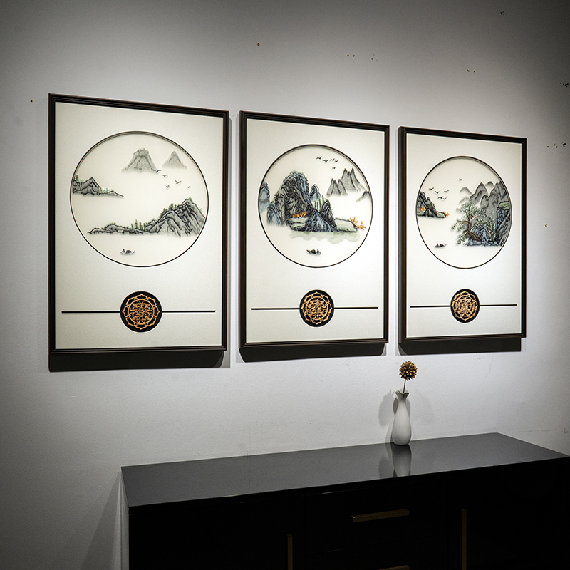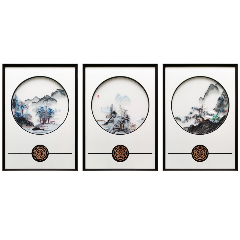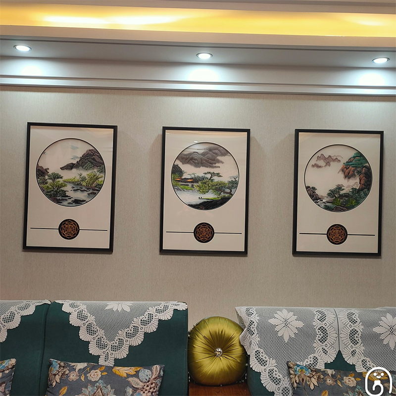 New Chinese mountain soda embroidery finished with frame hanging sofa background wall decoration of three Linxin Solid Cultural Wood