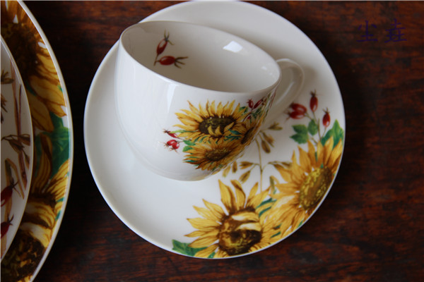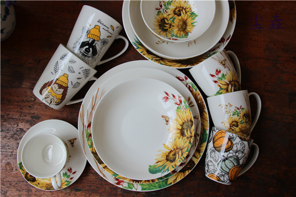 9 inch dinner plate 10.5 inch dinner plate pumpkin milk cup (below) salad bowl porridge bowl (foot flaw) large soup bowl vegetable plate sunflower milk cup (inner wall small red fruit) sunflower milk cup (inner wall small bee) coffee cup single cup (without plate
