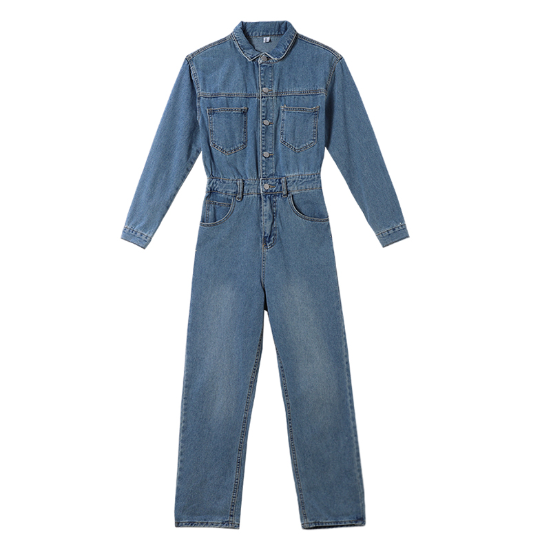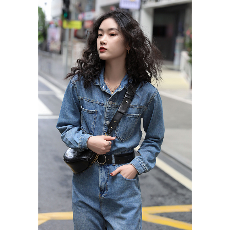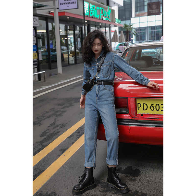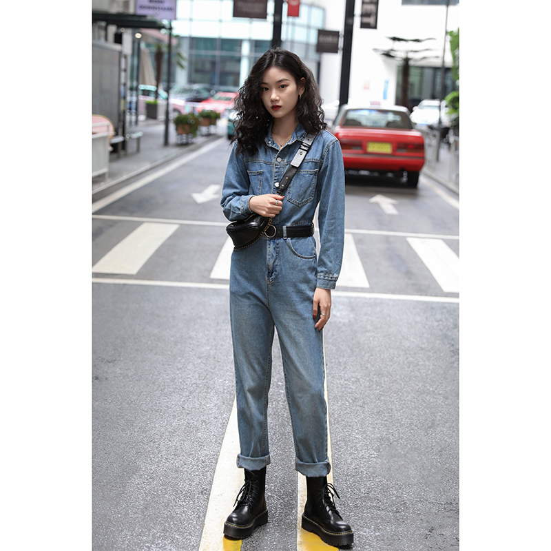 "You Lane" 2020 new autumn long-sleeved overalls and trousers are fashionable and slim. Receive a cowgirl blue one-piece suit