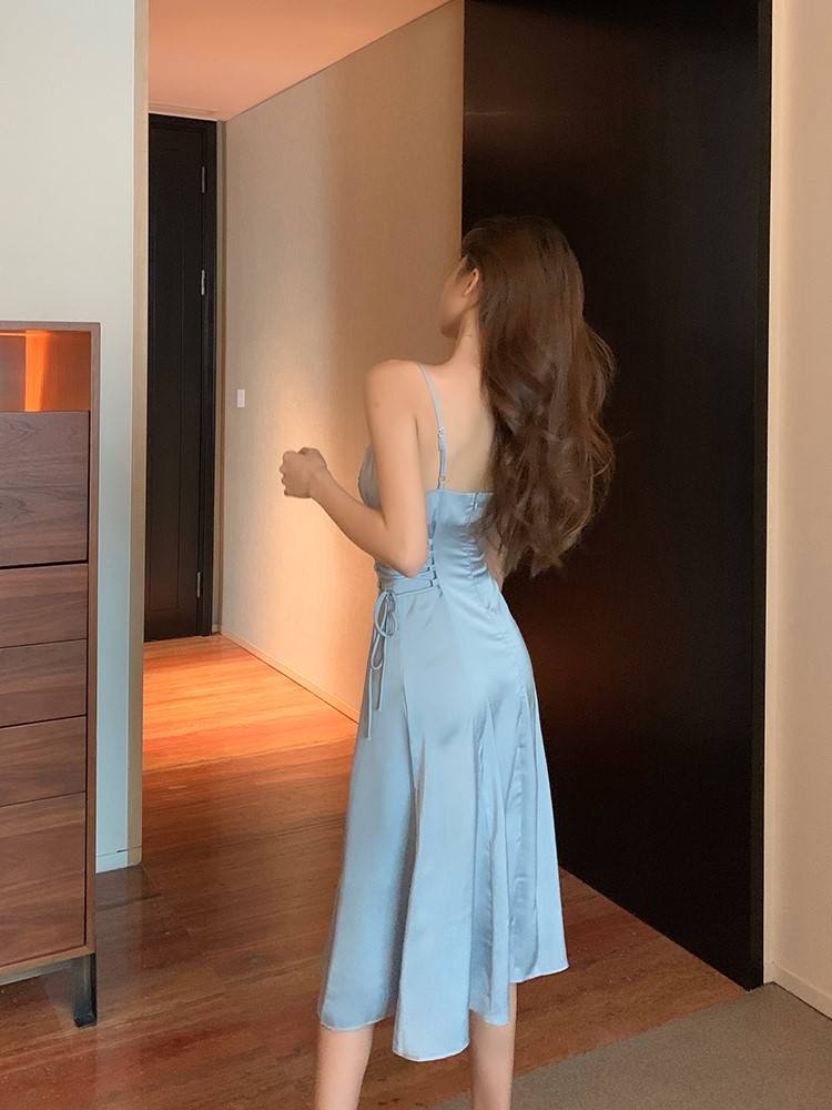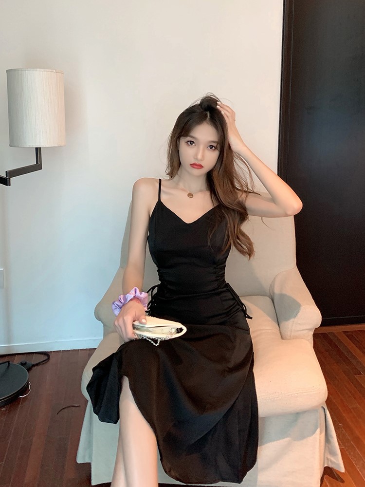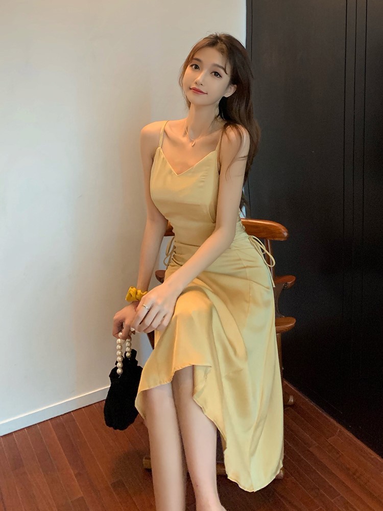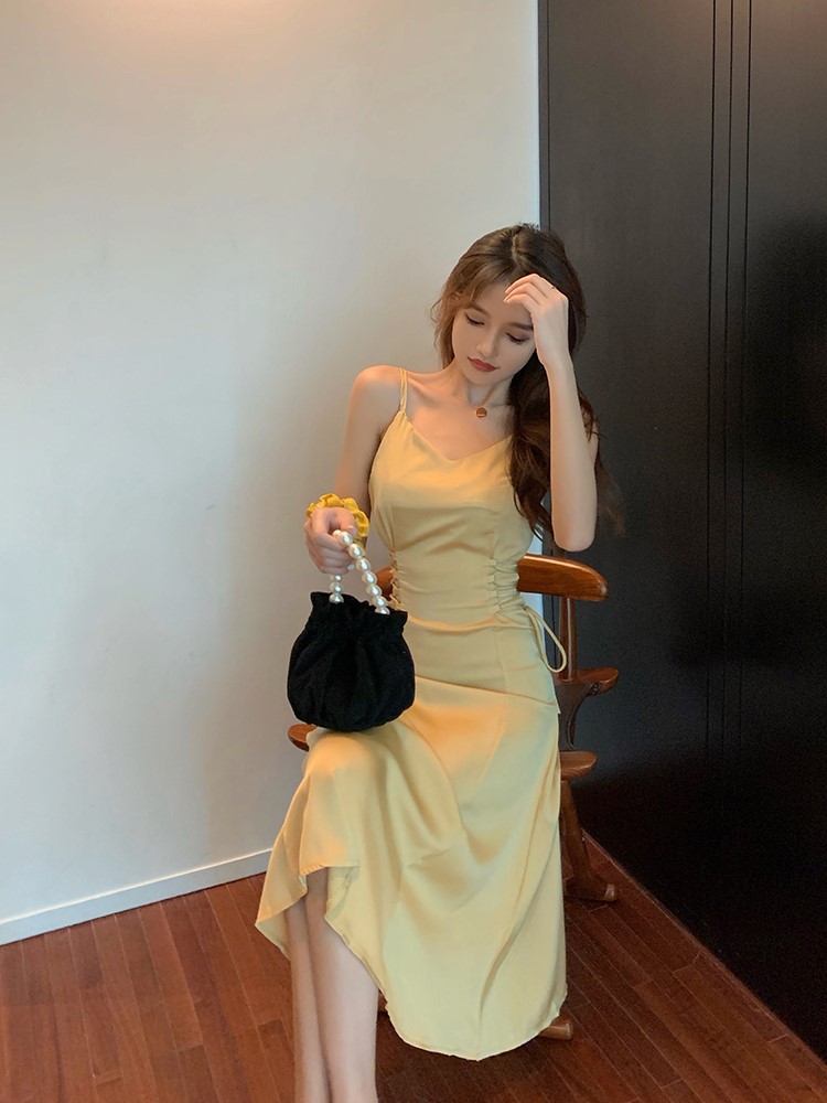 Yia Goddess Fan medium long version V collar pendant with skirt children 2020 Summer new collection waist display slim strap retro one-piece