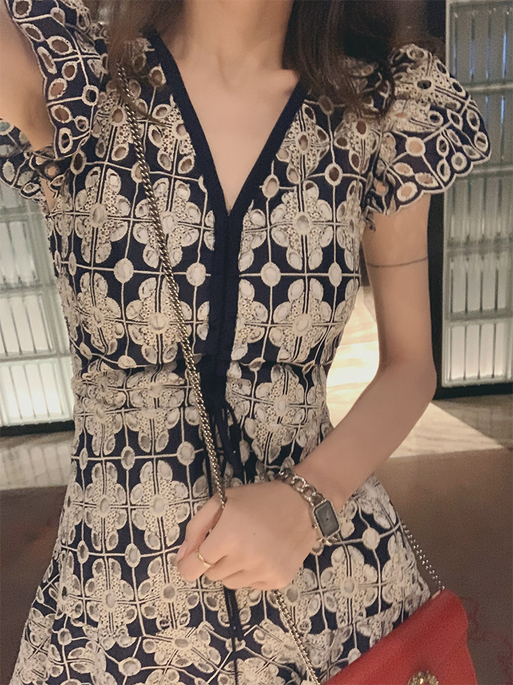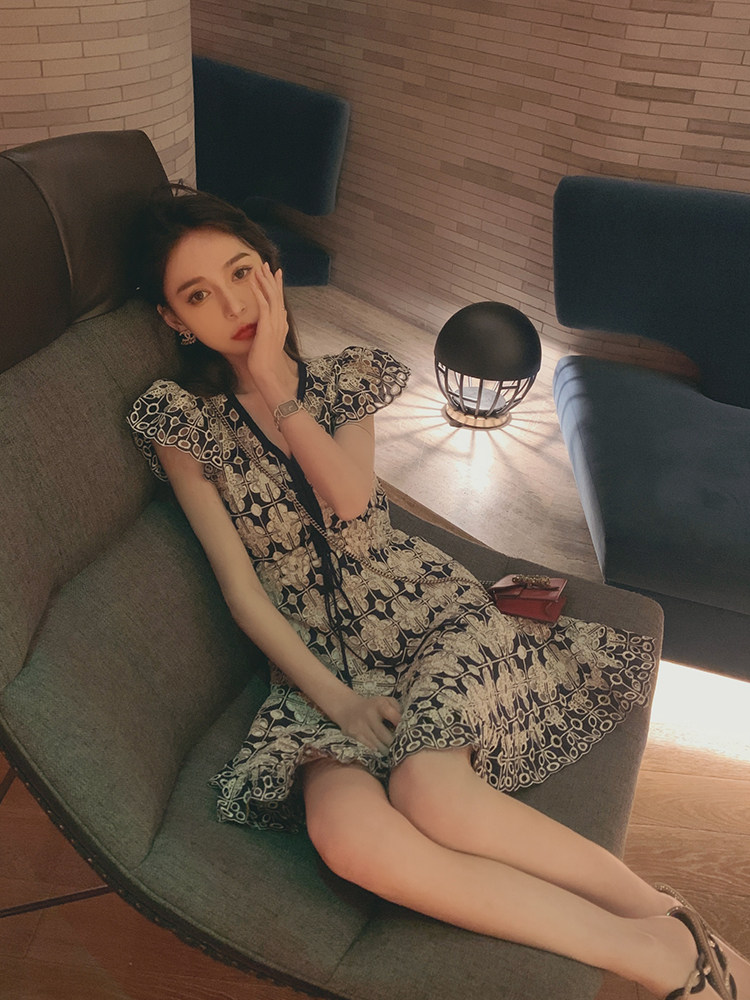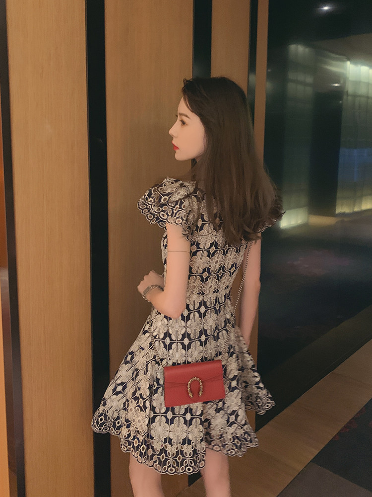 Juicecola light and mature style lace dress female 2022 summer new waist slim sexy hollow goddess fan