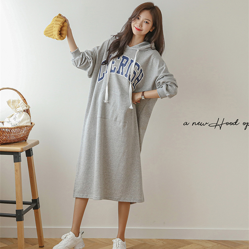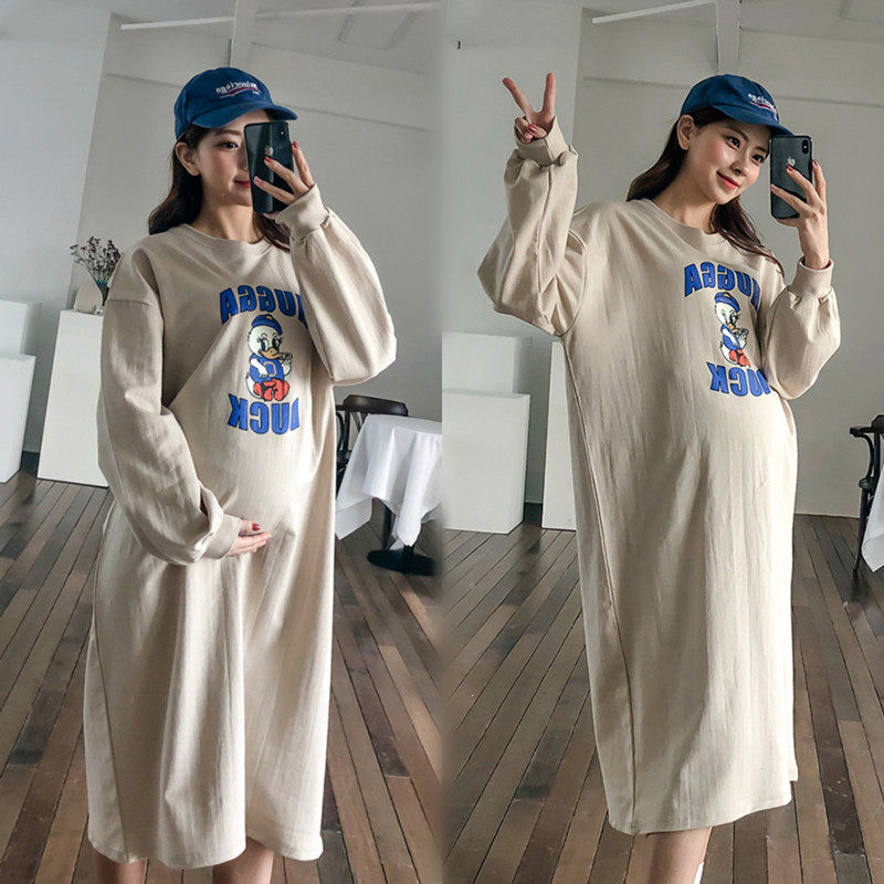 Extra size maternity autumn wear 200 pounds tops Korean version loose mid-length autumn dress cotton sweatshirt jacket