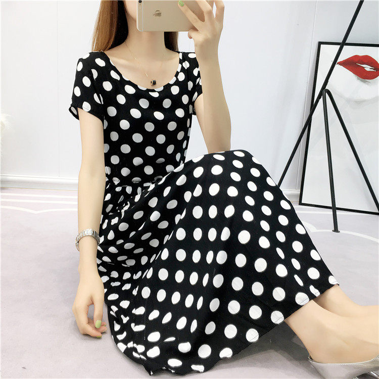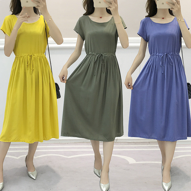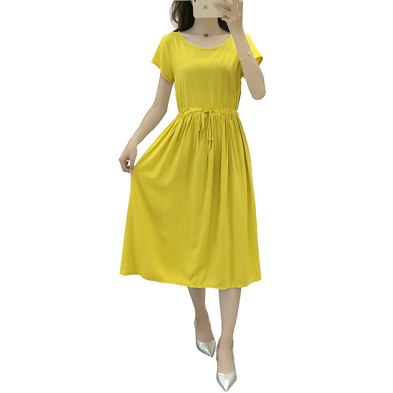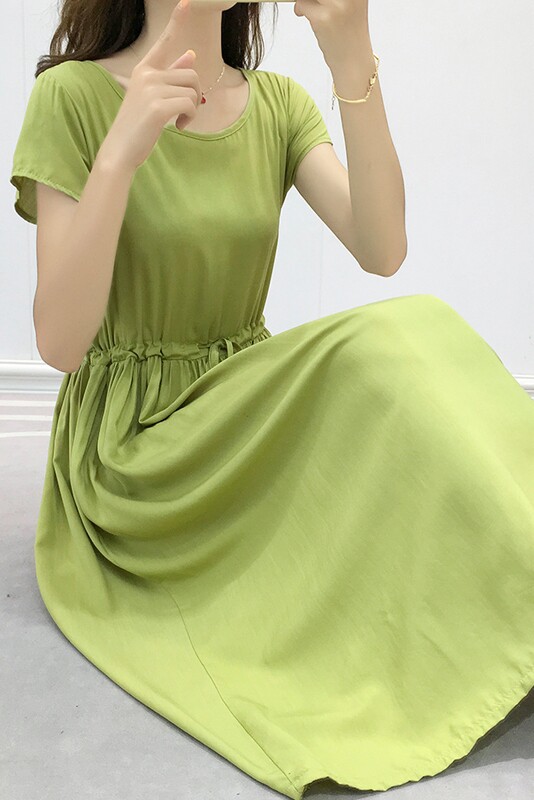 Pure color cotton silk dress summer fashion outerwear mid-length 2022 summer new short-sleeved drawstring waist beach skirt