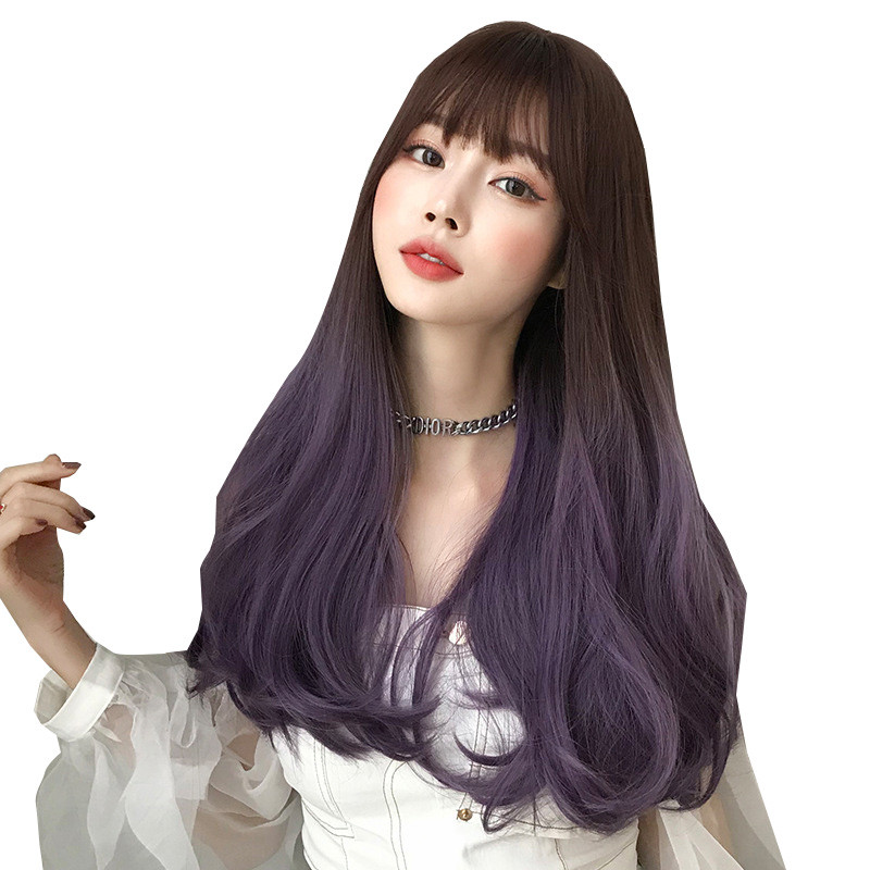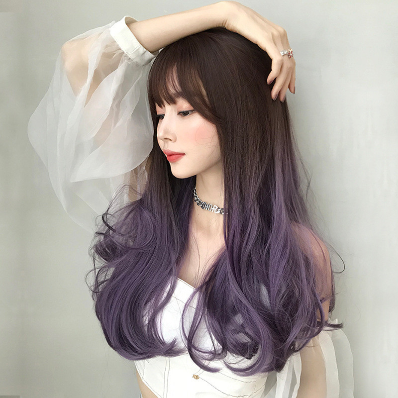 Air bangs lolita wig female long hair natural full headgear chemotherapy medium long hair gradient purple long curly hair