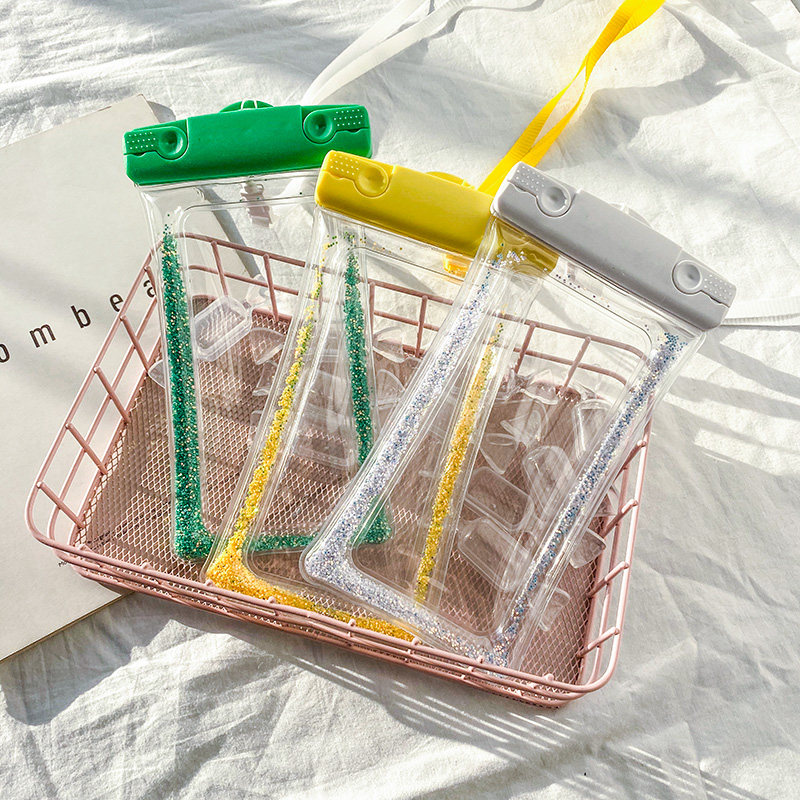 Pure colour sequin inflatable mobile phone waterproof bag sealing touch screen photo swimming Apple Huawei mobile phone universal diving cover