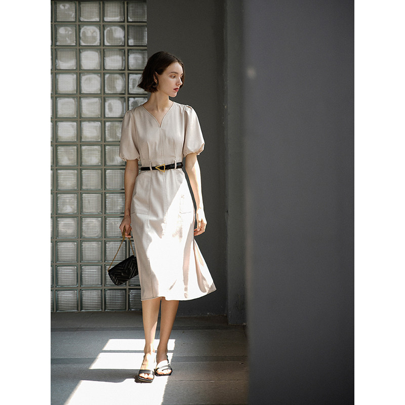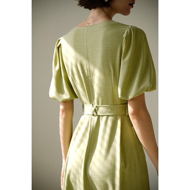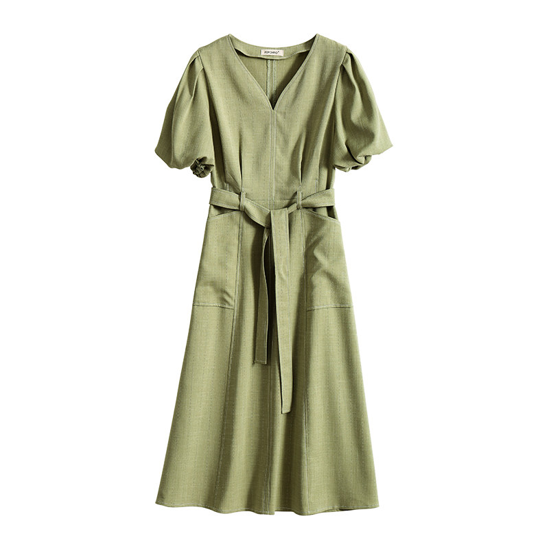 Okerui Retro Style Light Green V-neck Puff Sleeve French Dress Slim Mid-Length Skirt 2023 Women's Summer