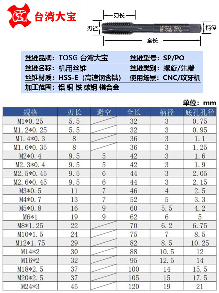 Taiwan's Big Bao TOSG machine with spiral screw tap M123456810 with cobalt plus hard first end stainless steel special screw tap