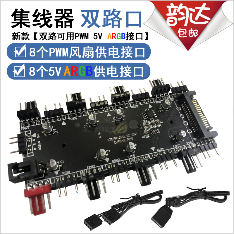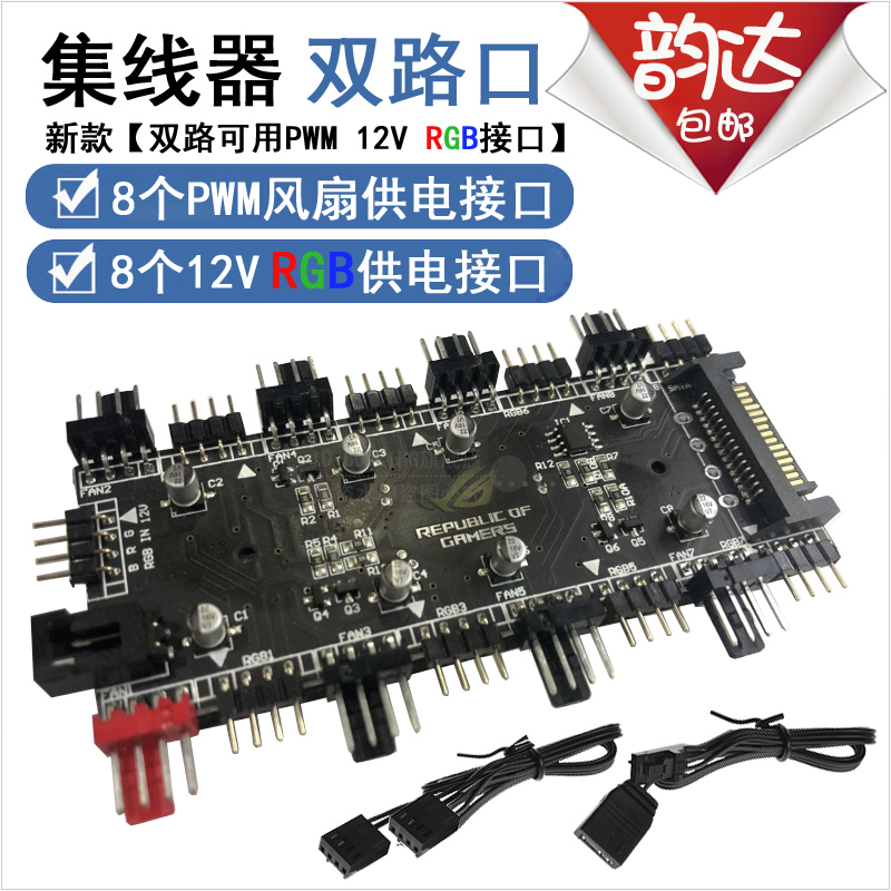 Dual 8-port hub 5V 3-pin PWM small 4pin(SATA power supply) Dual 8-port hub 12V 4-pin PWM small 4pin(SATA power supply)