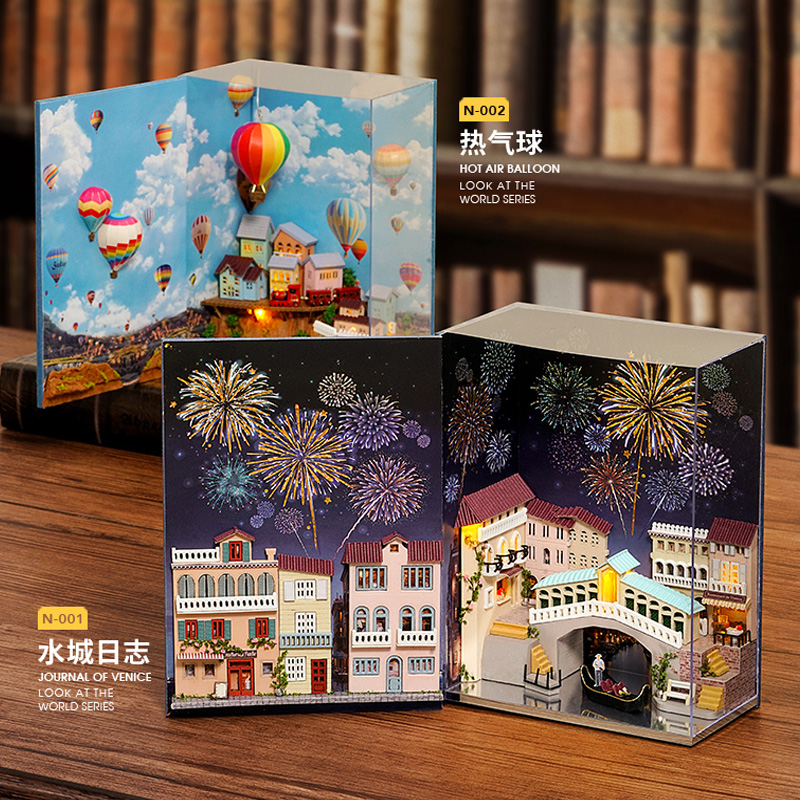 diy hut water city log hot air balloon bookend bookshelf handmade house assembly model creative gift female