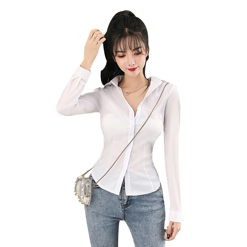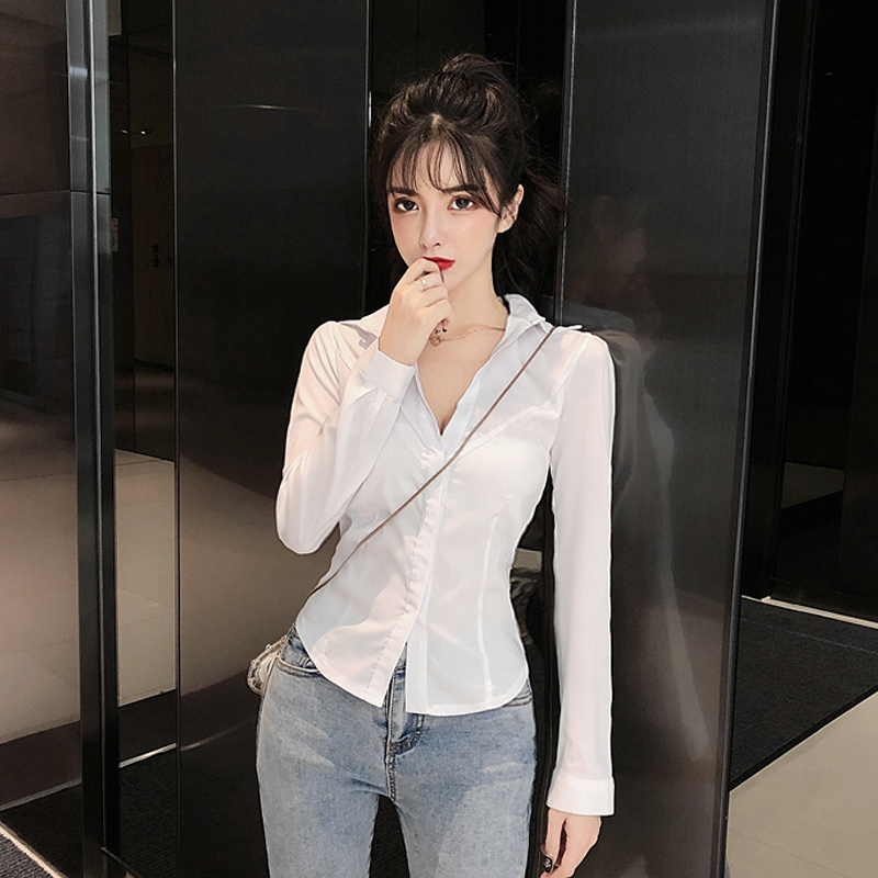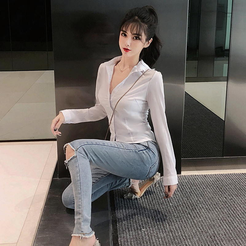 OL Career V Collar Long Sleeve White Shirt Woman Summer Uniform Seductive Nightclub Tights for a Sexy Temperament Blouse