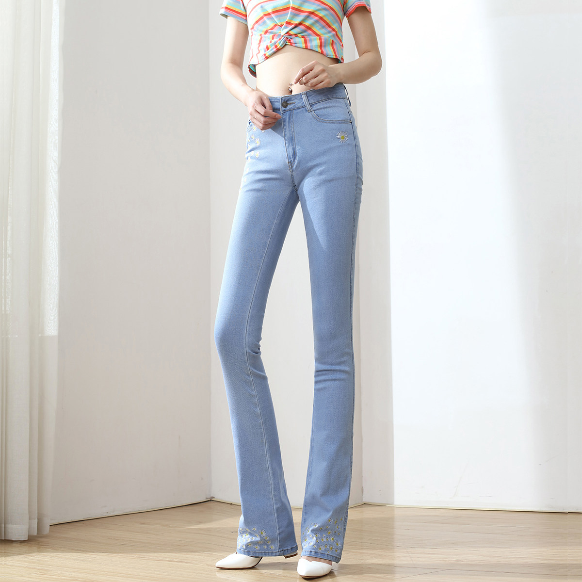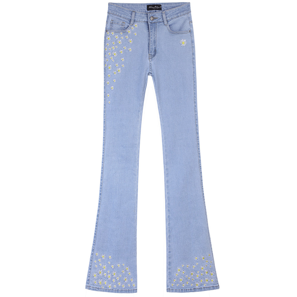 Tall taller 175 female summer thin micro horn pants lengthened denim pants overlong lifting hip daisy flowers long pants light color elasticity