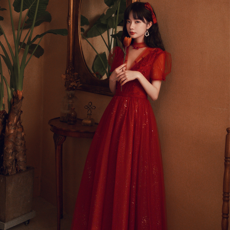 Wine red (temperament 9 sub-skirt) pink (not tug easy to walk) Wine Red Dress Chest Patch Bridesmaid Group Choir Graduation Group (more than 2 pieces 9 discount) Contact customer service