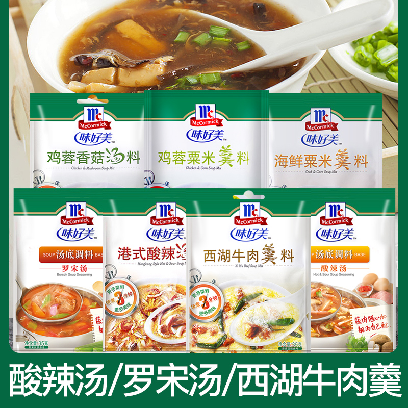 McCormick Sour and Spicy Soup Seasoning 35g*7 Bags McCormick Hong Kong-style Sour and Spicy Soup Ingredients 35g*7 Bags McCormick Merriam Broth Soup Base Seasoning 35g*7 Bags McCormick West Lake Beef Soup 35g*7 Bags McCormick Chicken Mushroom Soup 35g*7 Bags McCormick Seafood Corn Soup 35g*7 Bags 1 pouch of McCorn Soup each flavor