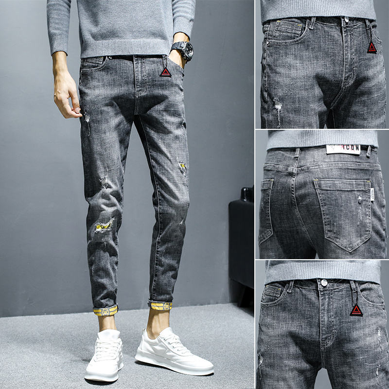 Jeans men's fashion brand autumn winter new slim small foot Korean version of the trend spring and autumn casual hole nine points pants men