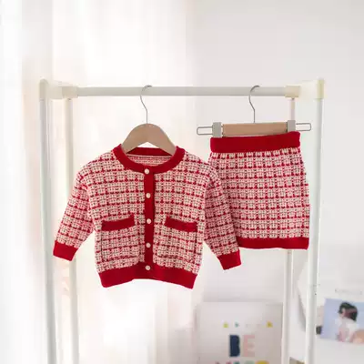 Autumn and winter new small and medium-sized girl plaid suit children's sweater skirt two-piece female treasure sweater cardigan