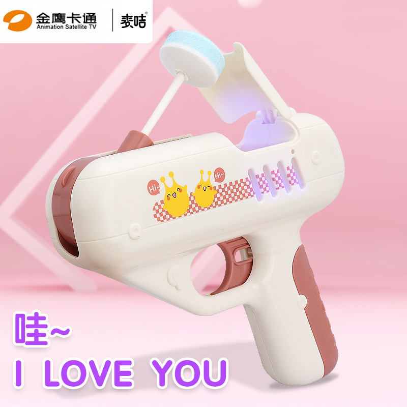 Shake-in-the-net red with a candy gun toy McCard sending a man and woman a friend gift surprise lollipop containing a gun