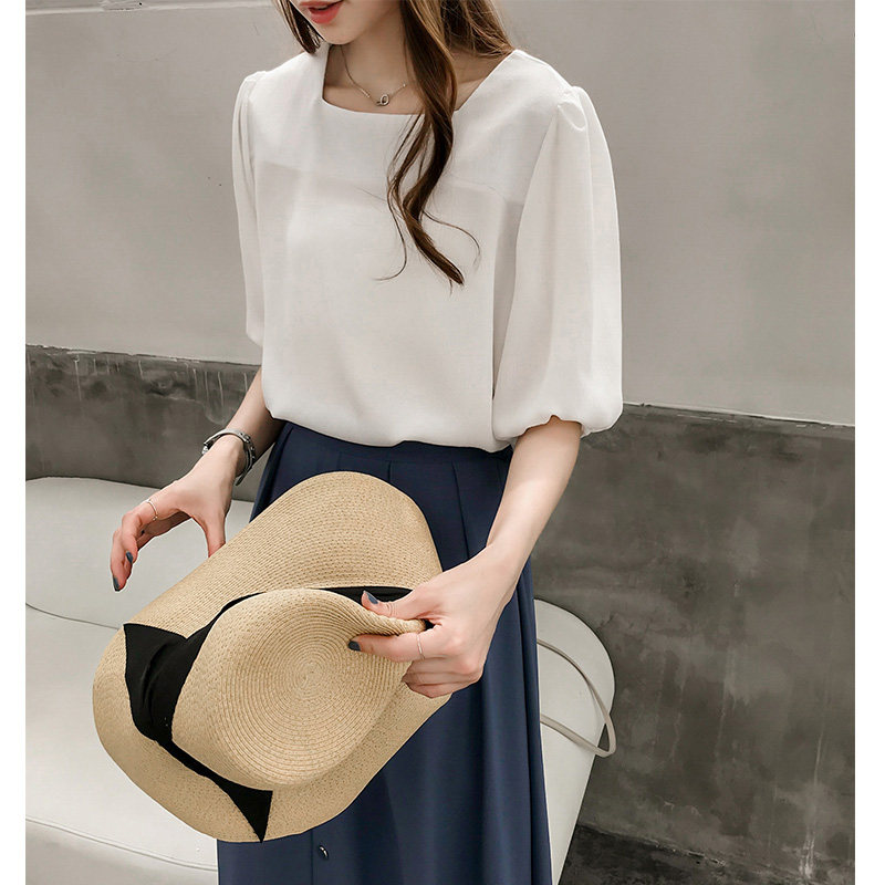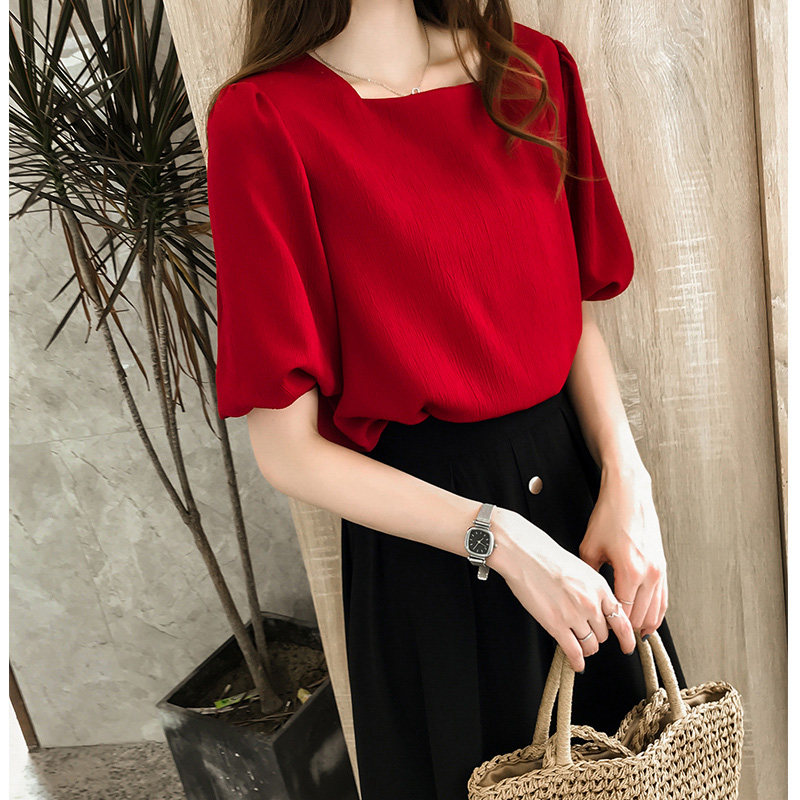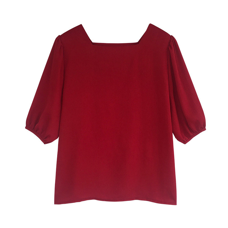 2021 high-end short chic gentle wind top niche design red square neck puff sleeve chiffon shirt summer