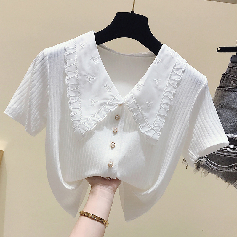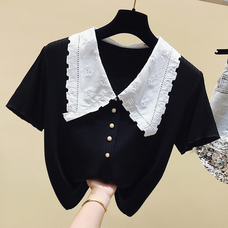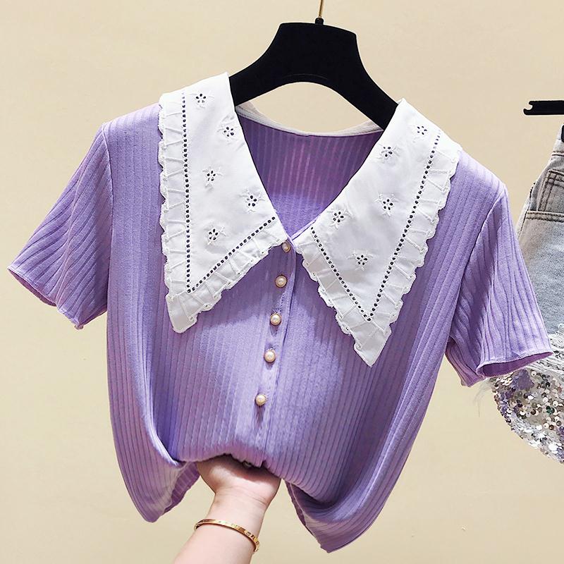 Large size dress Purple Ice Silk Needlenitwear Doll Collar Blouse micro Fat mm Belly Button Slim Loose Short Sleeve T Shirt Woman