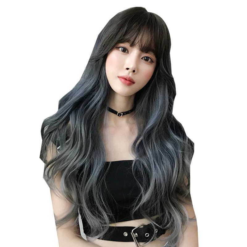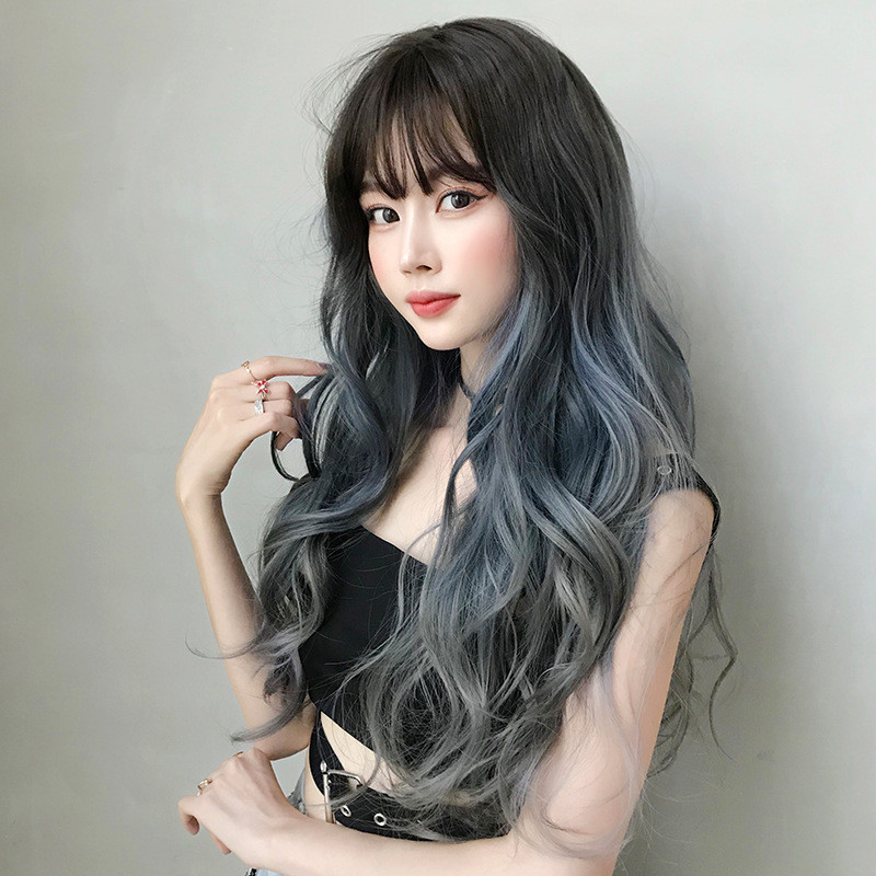 Ear hanging dyeing wig female long hair natural full head sleeve long curly hair chemotherapy mist blue pick up and dyeing of the gradual layer of grey mesh red