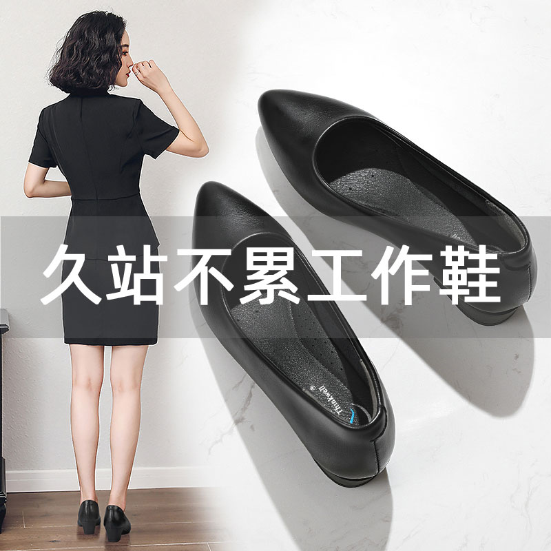 Work shoes women's summer black long standing flat bottom soft bottom soft surface comfortable not tired feet stewardess leather work high heels