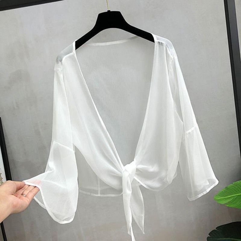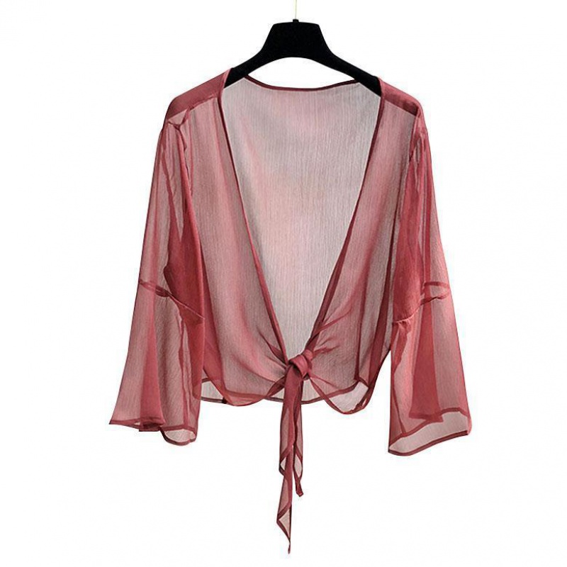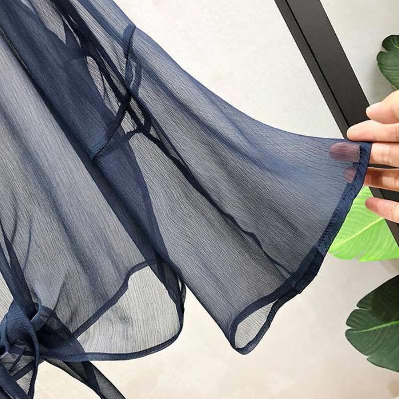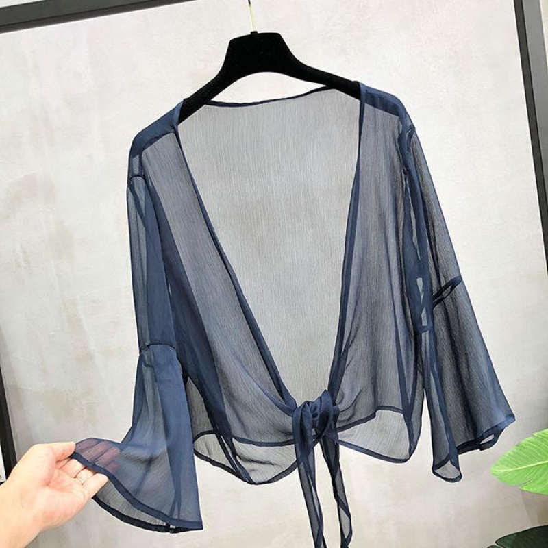 Spring and autumn short cardigan women's solid color wild horn sleeve Chiffon thin jacket with sundress small outer shawl