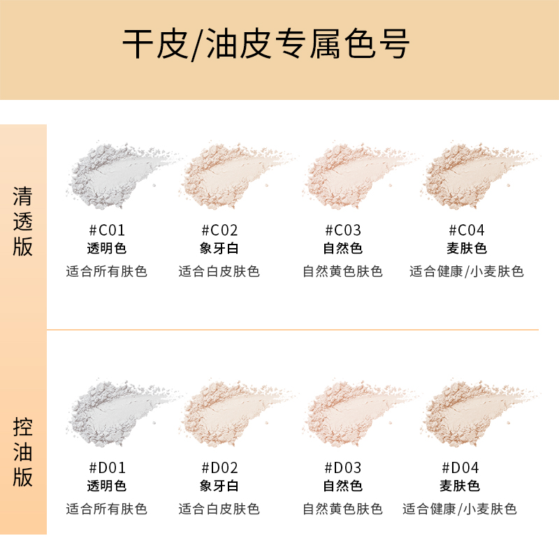 1# Transparent White (Classic) 13# Natural Color (Classic) 2# Vitality Powder (Classic) 34# Naked Transparent (Oil Control Waterproof Patent Version) 01# Natural Color (Oil Control)