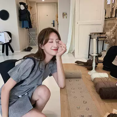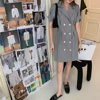Summer French temperament bubble sleeves waist thin can salt sweet double-breasted gray suit dress dress women