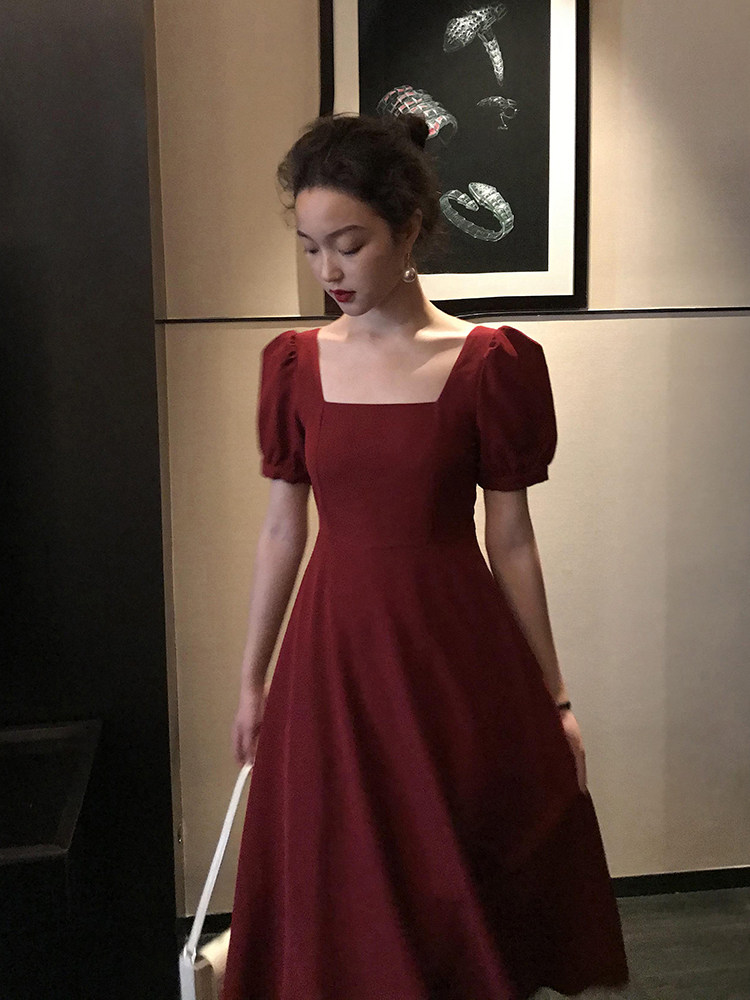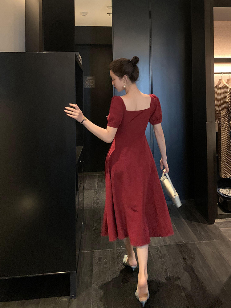Viss gold French vintage square collar burgundy dress women's 2021 waist thin temperament puff sleeves long skirt