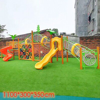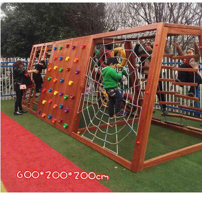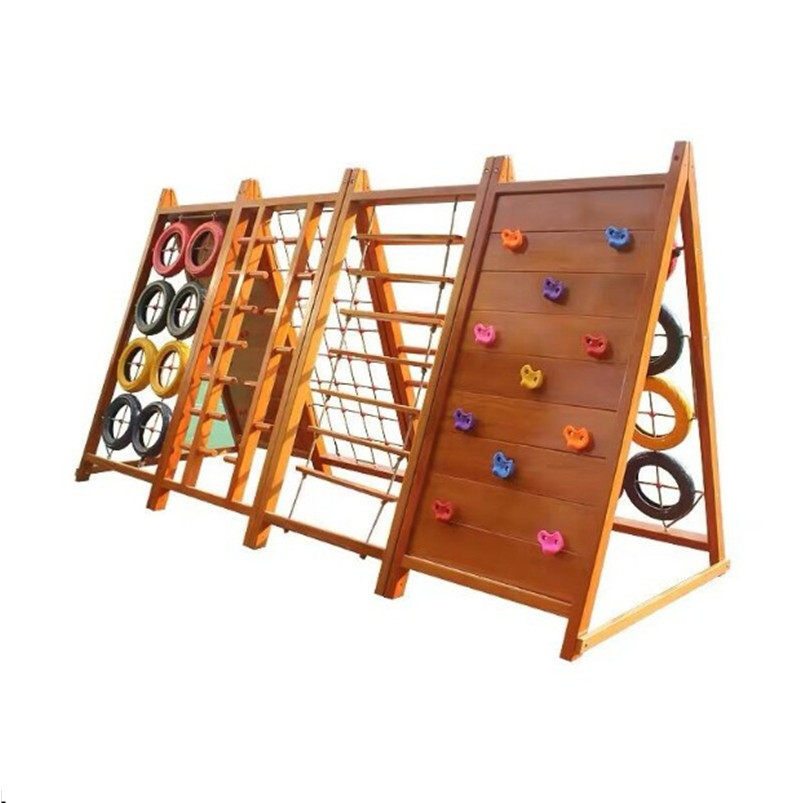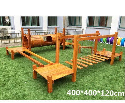 Kindergarten outdoor wood yellow flower pear children physical training combined slide ladder large climbing frame mesh bridge drill hole