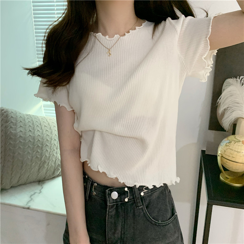 Black agaric side short sleeve knit T-shirt female summer 2022 new loose 100 hitch short round collar blouse