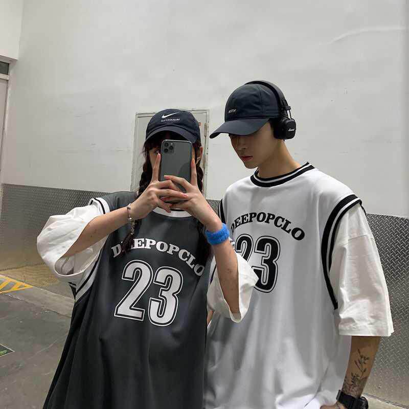 Basketball Suit Nets Red Couple Fake two short sleeves T-shirts Men's summer loose BF Wind blouse Sport T-shirt Female