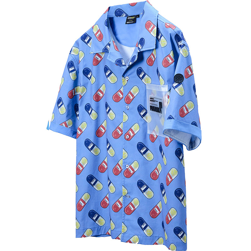 RNWL Guochao Hawaiian shirt male trend port Wind printed shirt female short sleeve men's wave card loose and handsome day department-Taobao