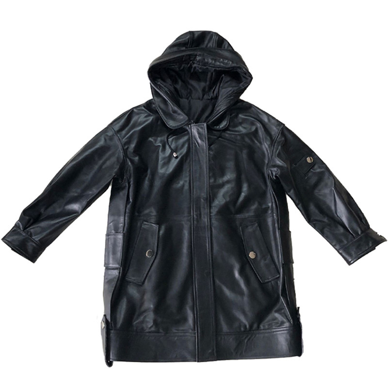 Leather hooded casual jacket women's autumn and winter new loose sheepskin leather coat large size medium-long leather windbreaker jacket