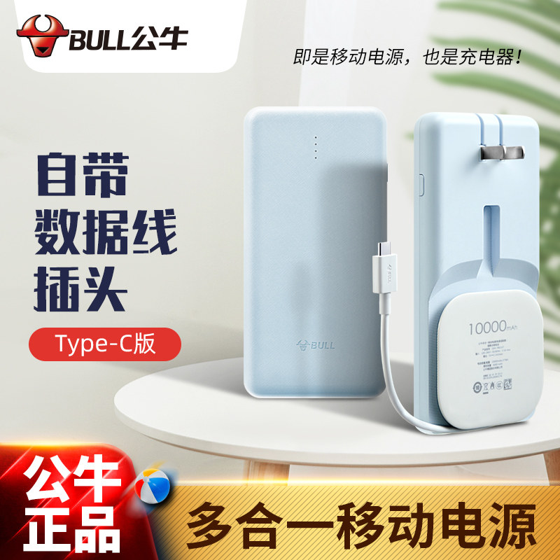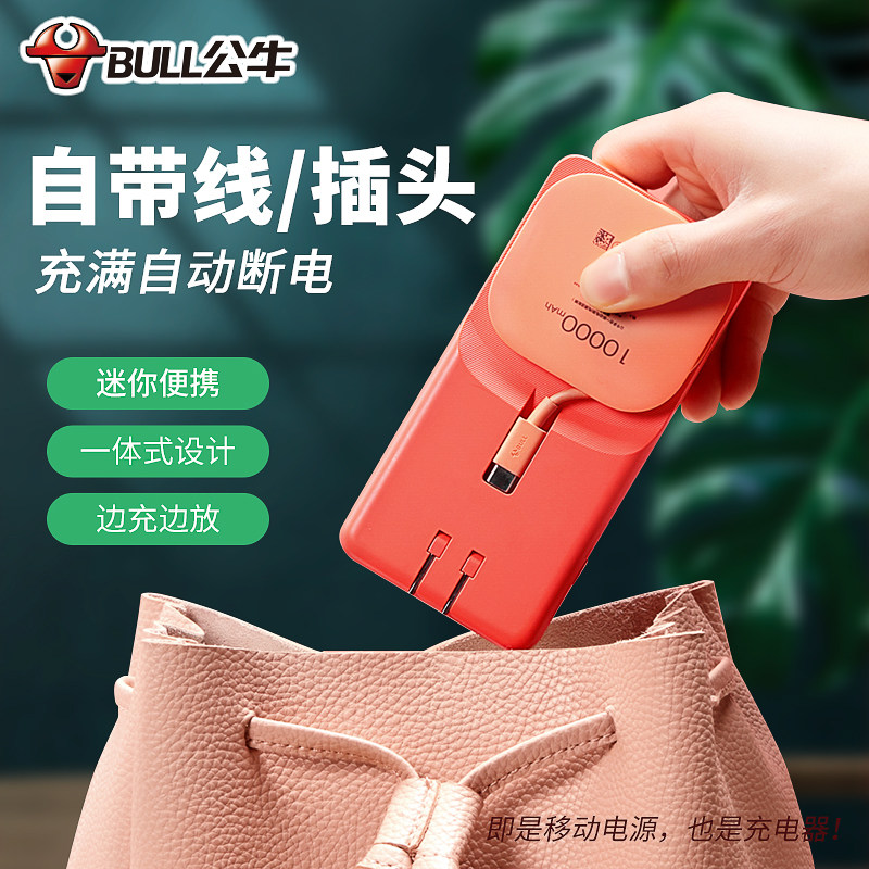Bull all-in-one full automatic power-off mobile power bank 10000mAh milliamp type-c Android with its own line large-capacity charging treasure smart anti-overcharge portable charger ultra-thin mini