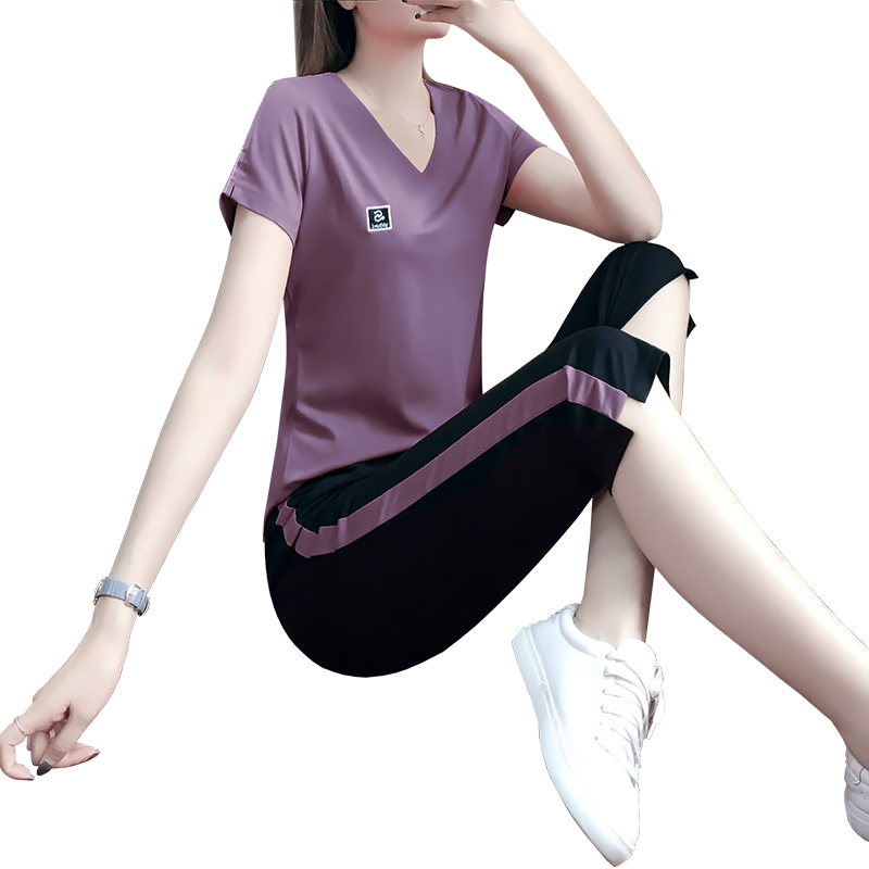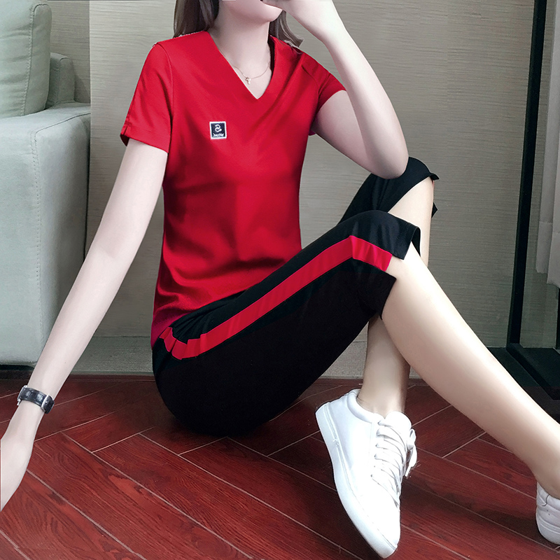 Sports suit women's summer cropped pants 2022 new Western style ice silk short-sleeved famous brand casual clothes large size two-piece set