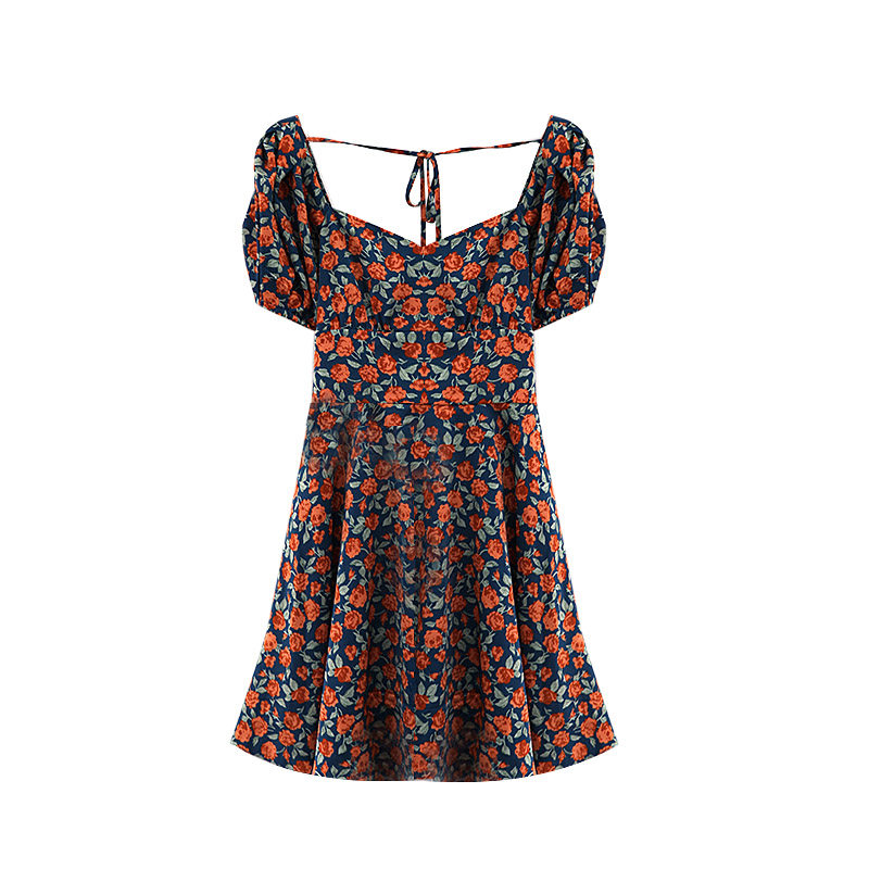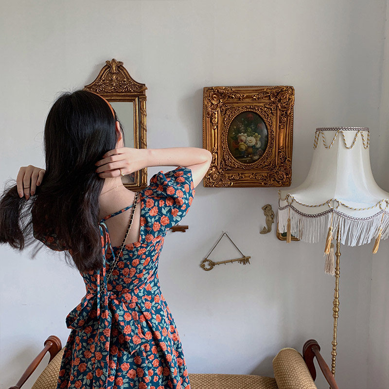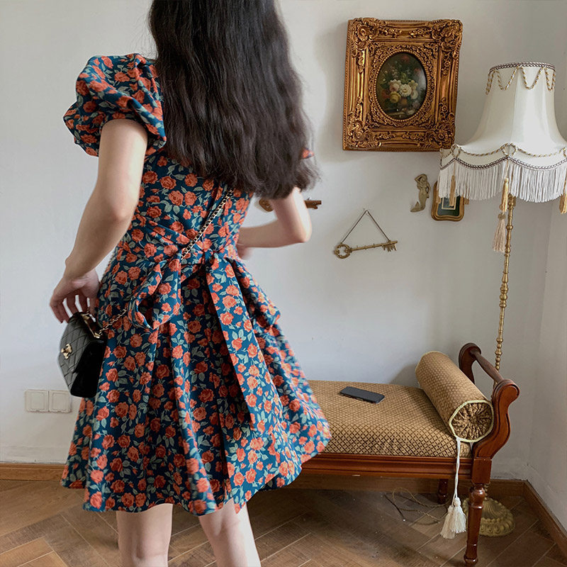 French square shoulder dating square collar skirt can be salty or sweet, small gentle wind, puff sleeves, floral dress, female summer