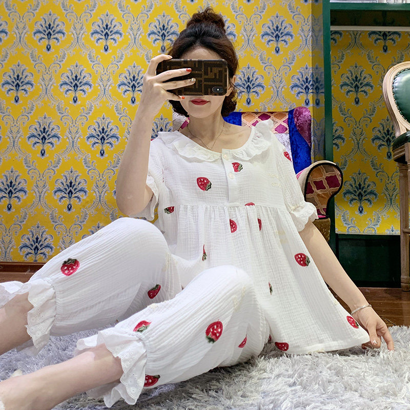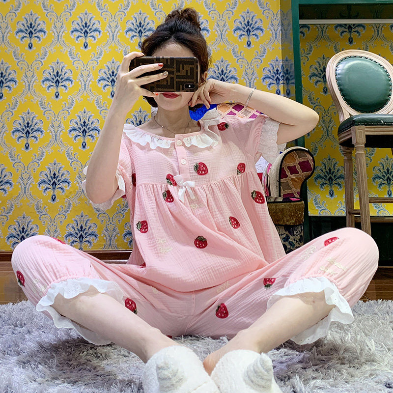 pink grape gauze cotton pajamas women's summer cropped pants princess sweet strawberry embroidery home wear thin section