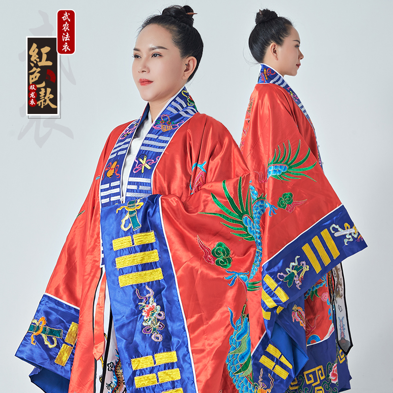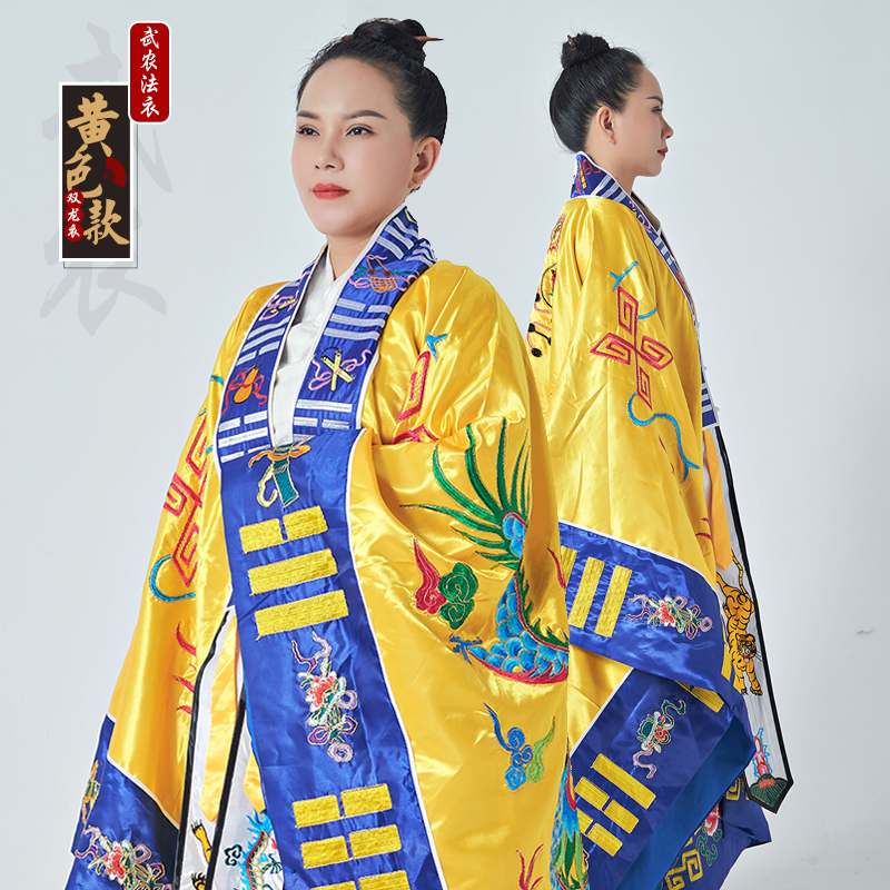 Taoist supplies large satin hand-embroidered double dragon clothes with sleeves yellow gold silk Taoist Taoist clothes Gao Gong Gong Fa dress