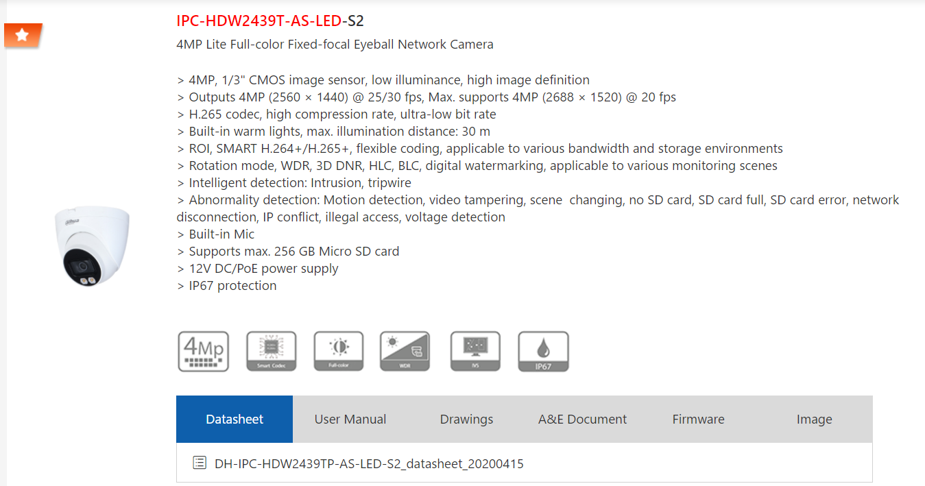 Dahua 4 million English version LED full color network Audio Dome DH-IPC-HDW2439TP-AS-LED-S2