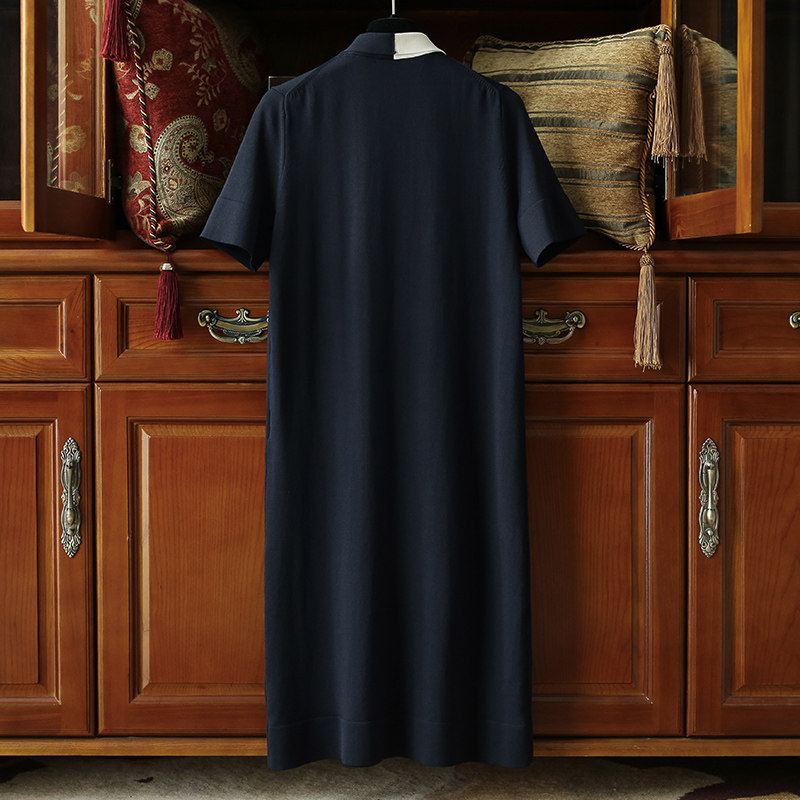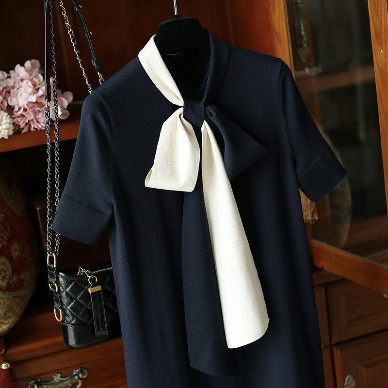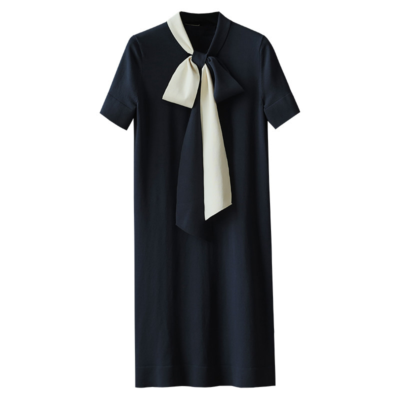 More than just a look, navy blue short-sleeved neckline contrast color tie mid-length dress women's summer 2020 new style