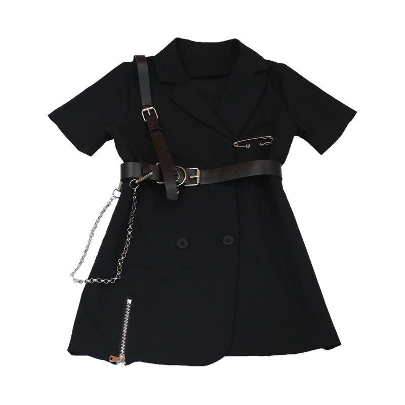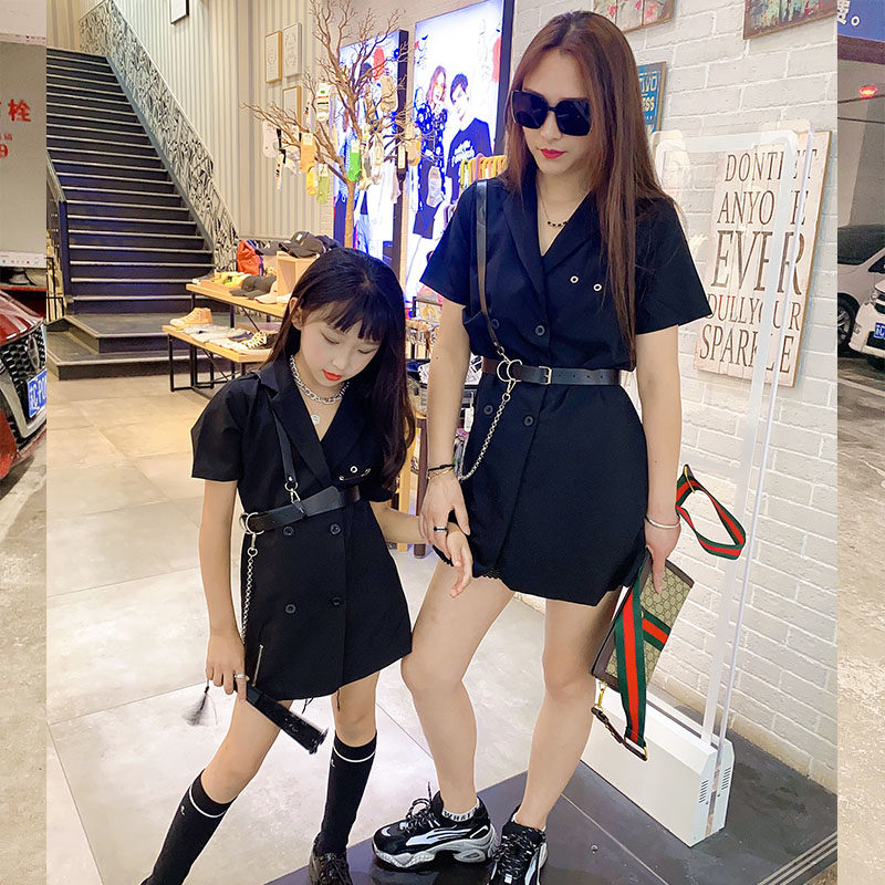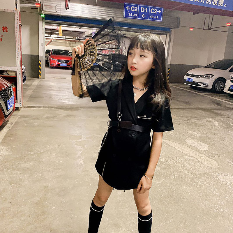 Girl Suit Jacket 2020 Autumn Dress New CUHK Child Dark Black Retro Tooling Skirt Long Sleeve Matching Belt Walk Show