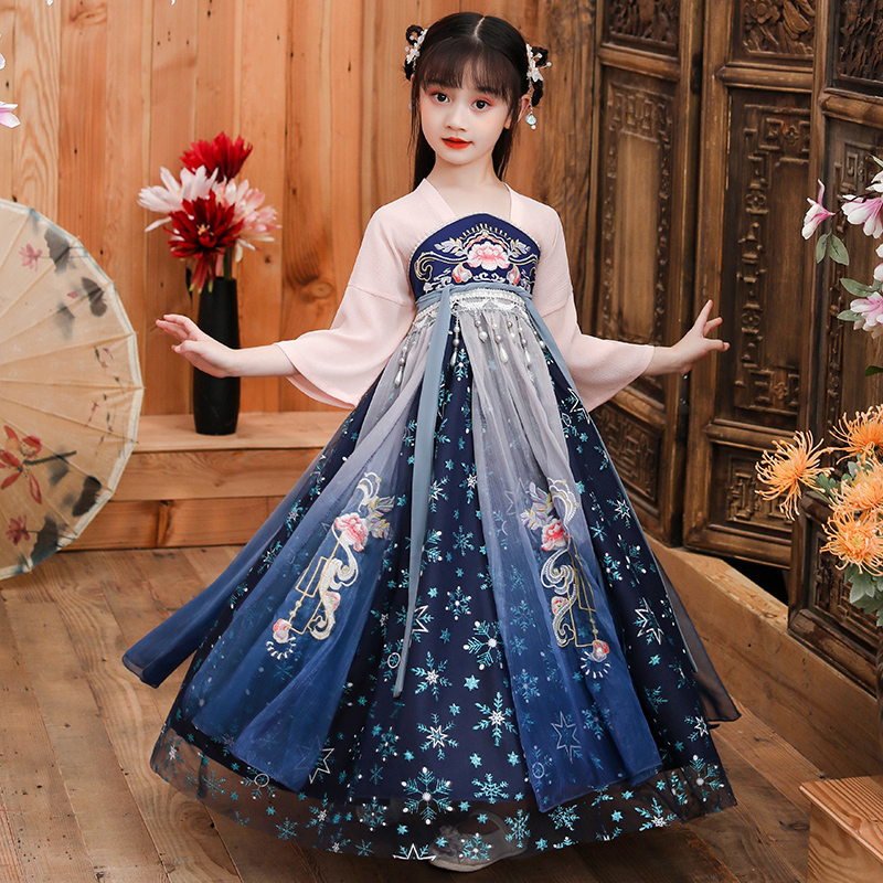 Hanfu Girl's Summer Ocean Dress Waft Super Fairy China Wind 12-year-old girl Ancient dress Skirt Elementary School Kids Don