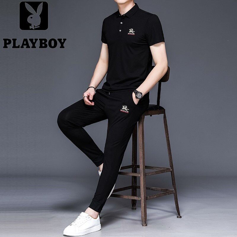 Floral Playboy Short Sleeve Sportswear Suit Men's Summer Thin black T-shirt Long pants Two sets of young summer clothes