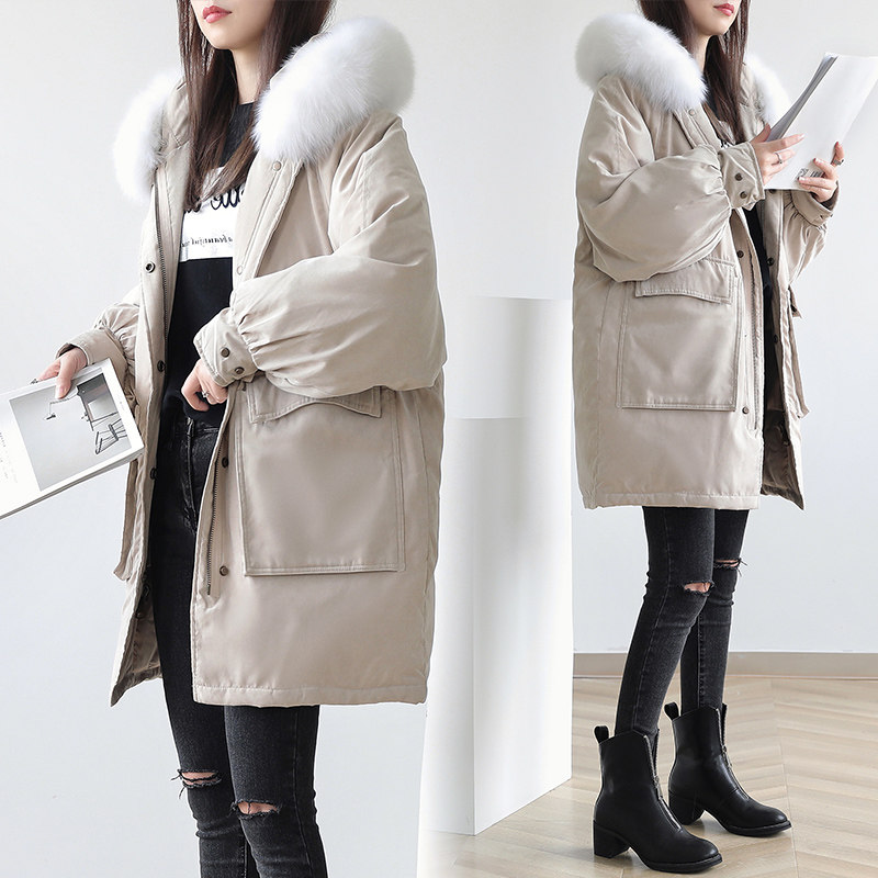 Off-season Korean version of the college style mid-length down jacket female student hooded loose casual thickening warm belt fur collar tide