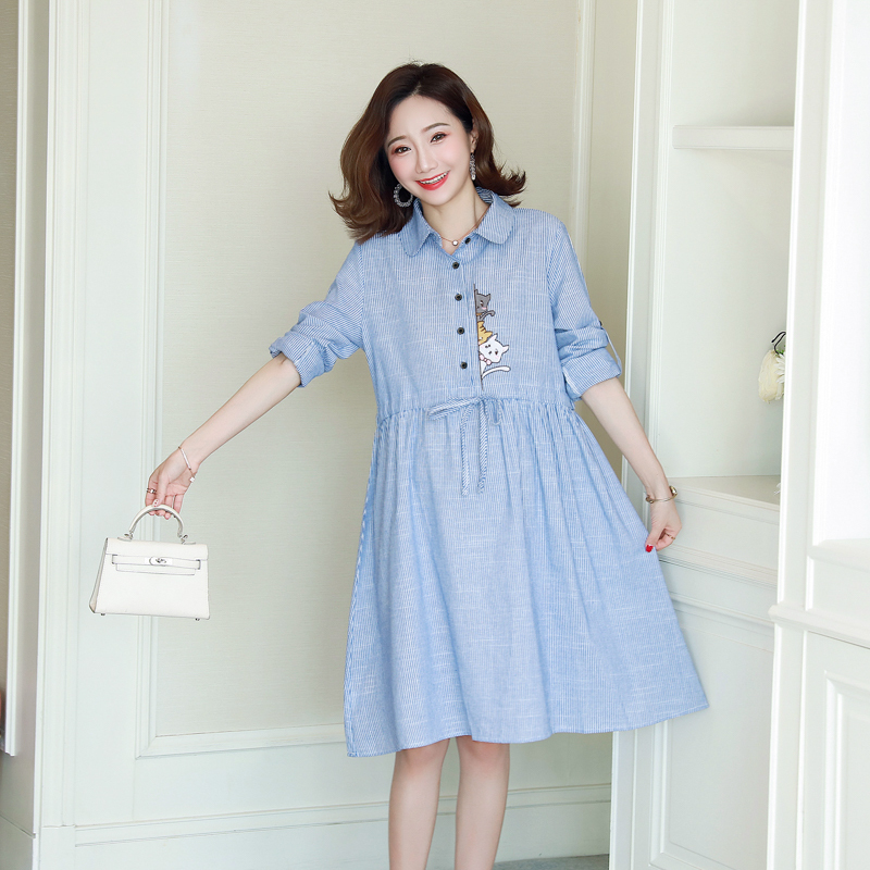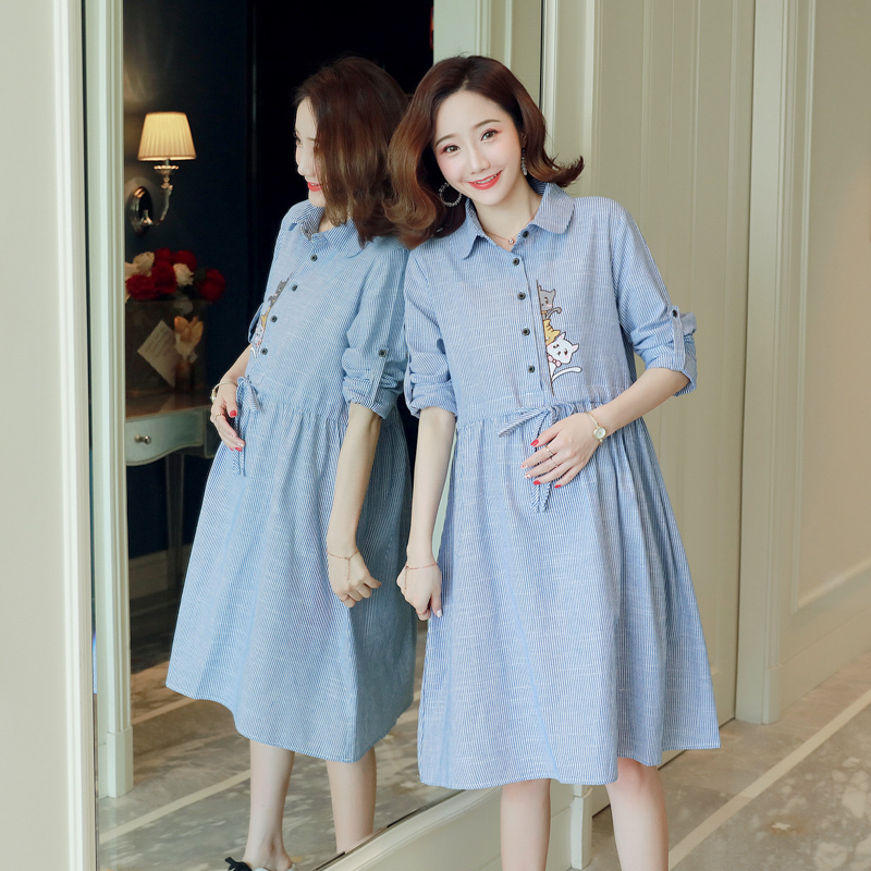 Web red pregnant women dress autumn 2021 new medium - long - range gas reduction age French striped dress