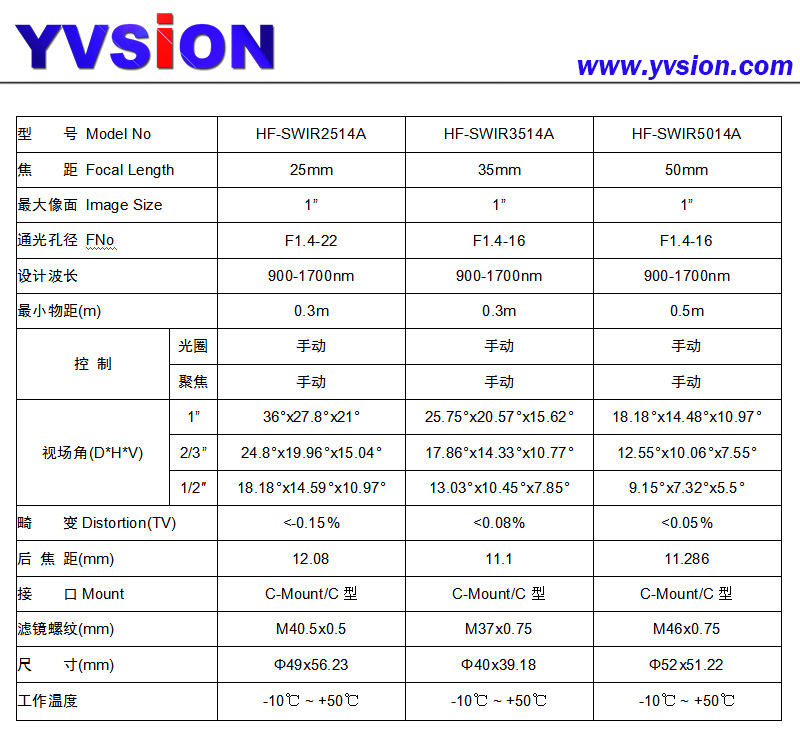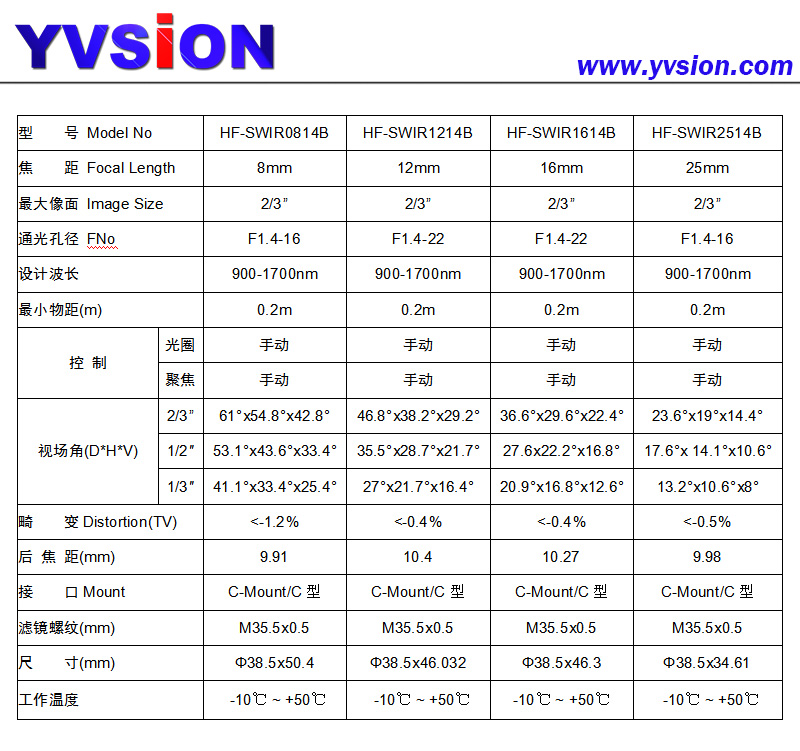 HF-SWIR series short wave infrared lens C-mount industrial lens for 900-1700nm infrared camera